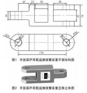 手扳葫蘆荷載監(jiān)測(cè)報(bào)警裝置工作原理:將荷載監(jiān)測(cè)報(bào)警裝置與手扳葫蘆有機(jī)連接組合,通過(guò)裝置對(duì)所受荷載的監(jiān)測(cè)報(bào)警實(shí)現(xiàn)過(guò)載保護(hù)。手扳葫蘆荷載監(jiān)測(cè)報(bào)警裝置的平面結(jié)構(gòu)圖和三維立體圖分別如圖1和圖2所示。