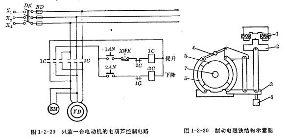 圖1-2-29為只裝有一臺電動機的電葫蘆控制電路,主要是用來提升貨物,圖中有兩個按鈕,1AN為提升按鈕,2AN為下降按鈕。為保證安全,為用接觸器的自鎖觸頭,因此在按下按鈕時電動機就轉動,松開按鈕,電動機就立即停止轉動。這種電路常稱為點動控制電路。當按下1AN時,接觸器1C使電動機轉動,將貨物起吊;當按下按鈕2AN時,接觸器2C使電動機向相反方向轉動,將貨物下降。由于常閉觸頭2C和1C的互鎖作用,在按下1AN后被誤按了2AN就不起作用,反之亦然,這樣可以防止電源短路事故的發(fā)生。XWK為終點開關(形成開關)當起吊貨物升到極限高度后,斷開終點開關觸頭,電動機自動停止運轉。ZM為片式制動器(見圖1-2-30)。制動電磁鐵的線圈為電動機電源并聯。當接通電源后,制動電磁鐵線圈通電,銜鐵2被吸上,借杠桿3及杠4的作用將瓦塊5推開,電動機軸7可以自由轉動。當電源斷開后,制動電磁鐵線圈也斷電,重物8將銜鐵2拉下,瓦塊5抱緊制動輪6,使電動機軸不能轉動,因而一旦出現停電,可以將被提升的貨物之車在任何一個高度上。