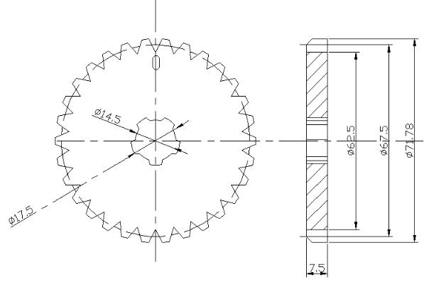 根據(jù)手拉葫蘆傳動(dòng)齒輪低速重載,根據(jù)手拉葫蘆傳動(dòng)機(jī)構(gòu)的原理由五齒長軸的小齒輪帶動(dòng)片齒輪甲、乙的,考慮到無齒長軸的小齒輪齒數(shù)甚小鄧特點(diǎn)。手拉葫蘆選用了齒形角20°的漸開線特種片齒輪變位齒輪,其基本齒形的基本參數(shù)如圖所示。選用齒形是考慮了以下因素:葫蘆傳動(dòng)齒輪的小齒輪數(shù)甚少為了避免根切和增強(qiáng)度,只能用正變位切削這樣小齒輪的外圓是受齒輪條的正切力,片齒輪與短軸屬于過硬配合,片齒輪的中心要設(shè)計(jì)出短軸尺寸屬過硬配合的小花鍵孔尺寸如圖所示: