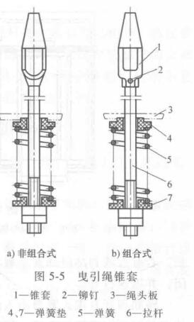 繩頭組合又稱拽引繩錐套,按其結(jié)構(gòu)形式可分為組合式和非組合式兩種,分為如圖5-5所示。組合式的拽引繩錐套和拉桿是兩個(gè)獨(dú)立的零件,它們之間用鉚釘鉚合在一起;非組合式的爪印繩錐套和拉桿是鑄成一體的。