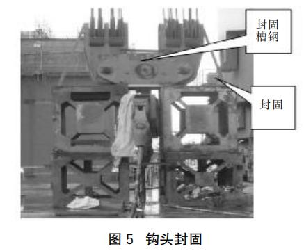 1、將下小車鉤頭放到墊架上,由其承受鉤頭的全部重量。由于溝通絞點(diǎn)較多,故采用槽鋼將鉤頭封固在墊架上,防止鉤頭歪倒,形式見圖5所示。