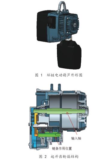 環(huán)鏈電動(dòng)葫蘆屬于輕小型起重設(shè)備,具有體積小、自重輕、使用靈活、操作方便、適用性強(qiáng)等特點(diǎn)。根據(jù)有無(wú)運(yùn)行機(jī)構(gòu)分為固定式環(huán)鏈電動(dòng)葫蘆和運(yùn)行式環(huán)鏈電動(dòng)葫蘆,其起升機(jī)構(gòu)的整體結(jié)構(gòu)布置方式通常有同軸輸入同軸輸出結(jié)構(gòu)和C形結(jié)構(gòu)布置兩種形式。文中研究的環(huán)鏈電動(dòng)葫蘆為固定式,起升機(jī)構(gòu)采用C形結(jié)構(gòu)布置形式。起升齒輪箱作為環(huán)鏈電動(dòng)葫蘆核心部件,必須確保在使用壽命期內(nèi)安全、可靠地工作,需要對(duì)起升齒輪箱進(jìn)行有限元靜力分析,以保證其強(qiáng)度、剛度滿足工程要求。