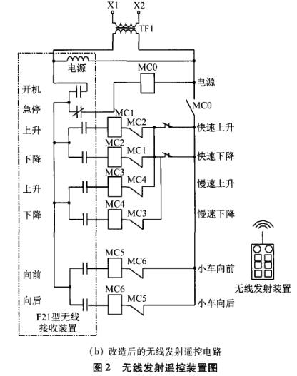無線遙控裝置主要是解決工作人員拖拽電纜帶來的安全隱患。無線遙控裝置采用F21一E 1B無線控制設(shè)備,裝 BJX 防爆接線箱內(nèi)實(shí)現(xiàn)防爆性能。該裝置把無線接收裝置接入電動葫蘆上的控制回路,用接收裝置內(nèi)繼電器控制板替代原按鍵的開關(guān)量進(jìn)行控制;無線發(fā)射裝置(遙控器)控制繼電器控制板的動作。兩臺電動葫蘆無線控制裝置采用不同頻率的電路板進(jìn)行控制,以避免誤動作。控制回路電路圖如圖2所示。