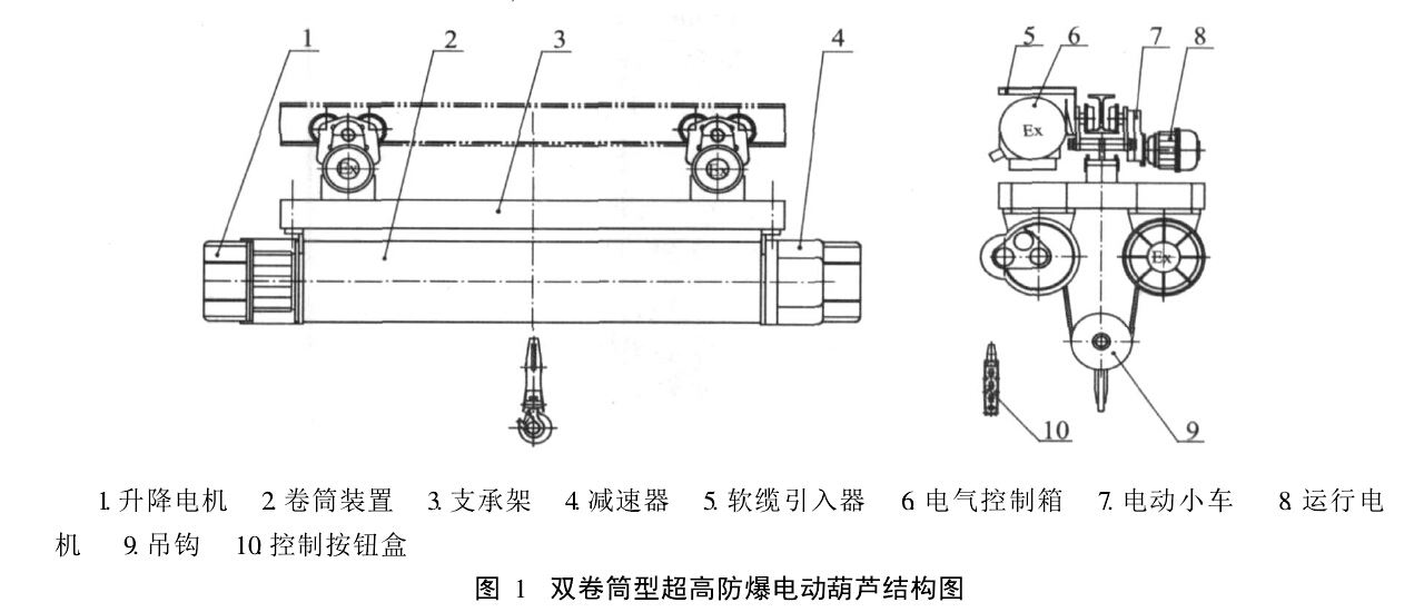 當超高電動葫蘆外來電源通電后,放開控制按鈕盒10的急停開關,按一下控制按鈕盒的總開按鈕,電氣控制箱6內(nèi)的總停交流接觸器吸合并自鎖,再按控制按鈕盒的升降按鈕,電氣控制箱內(nèi)的升降交流接觸器吸合,升降電機1起動,帶動減速器4輸入軸轉(zhuǎn)動,并通過三級齒輪減速,再由減速器的輸出軸驅(qū)動卷筒裝置2內(nèi)的卷筒轉(zhuǎn)動,從而纏繞鋼絲繩使吊鉤9升降起吊重物,升降按鈕放開時,電氣控制箱內(nèi)的升降交流接觸器斷電,升降電機1的錐形轉(zhuǎn)子受內(nèi)部彈簧壓力的影響而軸向運動,使內(nèi)部風扇制動輪制動,電動葫蘆停止升降;若再按下控制按鈕盒的運行按鈕,電氣控制箱內(nèi)的運行交流接觸器吸合,運行電機8起動,通過驅(qū)動裝置減速帶動電動小車7的車輪左右運行,運行按鈕放開時,電氣控制箱內(nèi)的運行交流接觸器斷電,運行電機的錐形轉(zhuǎn)子受內(nèi)部彈簧壓力的影響而軸向運動,使內(nèi)部風扇制動輪制動,超高電動葫蘆停止運行。當發(fā)現(xiàn)超高電動葫蘆工作異常時,按一下控制按鈕盒的急停開關即可切斷電源。雙卷筒型超高防爆電動葫蘆結(jié)構(gòu)見圖1。