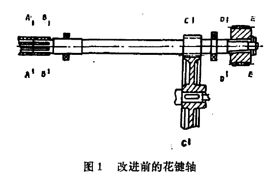 花鍵軸改進(jìn)前的結(jié)構(gòu)如圖1所示。左端通過剛性花鍵套與電動機(jī)軸相聯(lián)。右端DE處裝有內(nèi)外花鍵的花鍵套,該花鍵套的外花鍵上裝著制動摩擦片。花鍵軸C處是軸齒,通過與其相嚙合的大齒輪傳遞運(yùn)動和動力。電動葫蘆在吊載作業(yè)時(shí),由于頻繁地起升或制動,使在瞬間的加速度發(fā)生很大變化。在起升載荷時(shí)這種作用在軸上的沖擊扭應(yīng)力將達(dá)到很高,甚至?xí)^靜應(yīng)力的許多倍。當(dāng)電動葫蘆吊重起升時(shí),該軸AC段內(nèi)受扭矩作用,至使應(yīng)力集中嚴(yán)重的B處發(fā)生疲勞斷裂。在起吊中突然制動時(shí),即相當(dāng)E點(diǎn)突然固定,這時(shí)沖擊扭應(yīng)力作用在CE段內(nèi),有可能使應(yīng)力集中較嚴(yán)重的D處發(fā)生疲勞斷裂。實(shí)際工作中經(jīng)常斷裂的部位恰好在B、D兩處。但B處斷裂的機(jī)會多于D處。