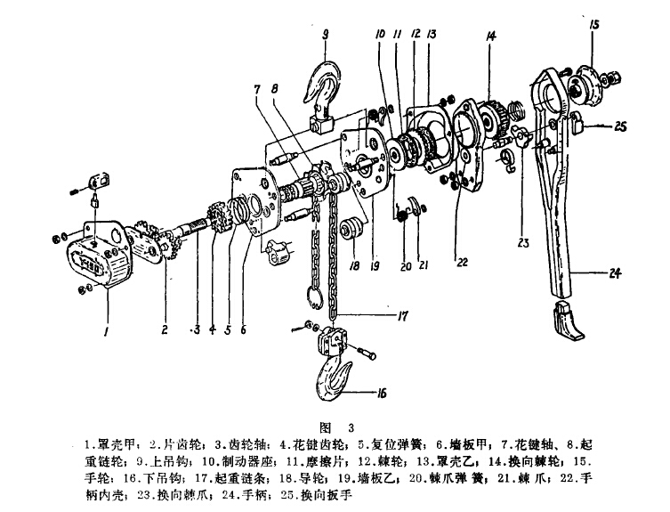 一級齒輪傳動(dòng)的環(huán)鏈?zhǔn)职夂J,一般采用的是棘爪脫離棘輪嚙合的離合裝置。結(jié)構(gòu)簡單,使用方便。但在日本也有采用脫開齒輪嚙合的離合裝置,這種離合裝置的構(gòu)造相對復(fù)雜一些,但空載情況下調(diào)整下吊鉤的位置非常松快。